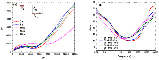 On the other hand, in the Bode plot, the middle frequency range displays an angle of approximately 50°, which is identified as capacitive behavior. Likewise, the phase maximum associated with the double electric layer increases with an increase in the treatment time, implying a reduction in the corrosion rate of the electrode. Also, it can be observed that the semicircle increases as a function of the treatment time, with the highest impedance for the PHB-coated sample at 10 s. This implies a strong enhancement of corrosion resistance due to the protection given by the PHB coating.