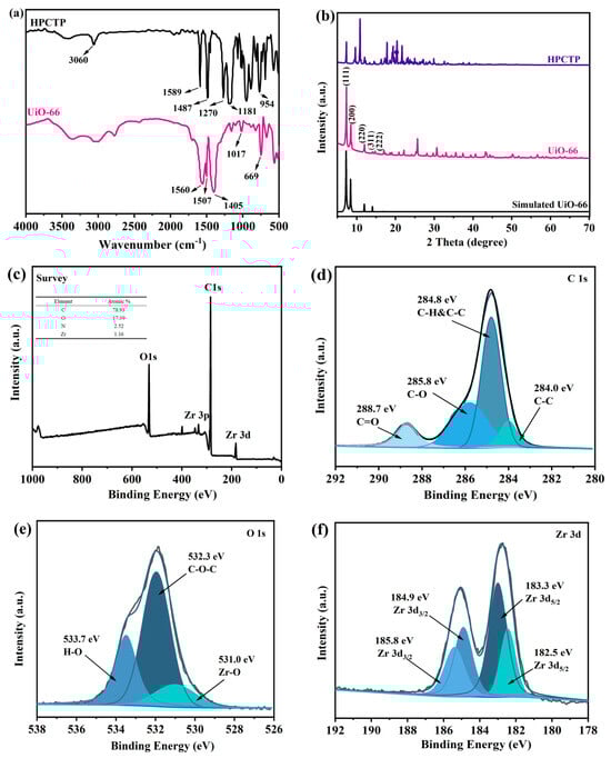 Structure analysis: (a) FT−IR spectra of UiO-66 and HPCTP, (b) XRD patterns and simulations of UiO-66 and HPCTP, (c) XPS survey spectra of UiO-66, (d) XPS spectra of C 1s, (e) XPS spectra of O 1s, and (f) XPS spectra of Zr 3d.