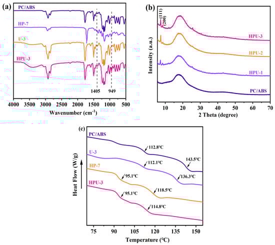 (a) FT-IR spectra of PC/ABS, HP-7, U-3, and HPU-3 samples. (b) XRD spectra of PC/ABS and HPU-n series. (c) DSC curves of PC/ABS, HP-7, U-3, and HPU-3 samples.