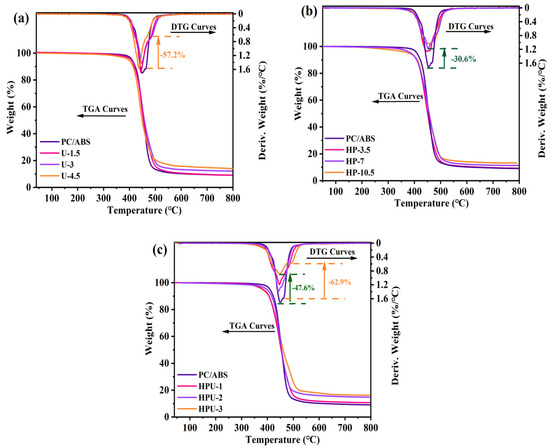 TGA and DTG curves of the PC/ABS blends: (a) UiO-66 flame-retardant series sample (U), (b) intumescent flame-retardant system sample (HP), and (c) UiO-66 cooperative intumescent flame-retardant system sample (HPU).