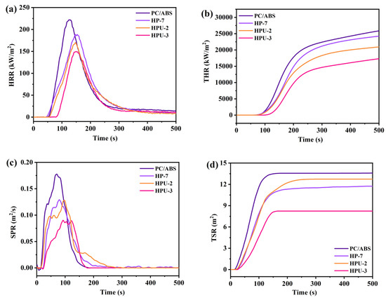 (a) Heat release rate (HPR), (b) total heat release (THR), (c) smoke production rate (SPR), and (d) total smoke production (TSR) curves of the PC/ABS blends.