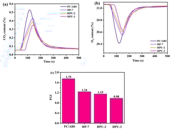 Figure 7 illustrates the changes in CO2 and O2 contents during CCT. Upon the addition of UiO-66, the O2 peak gradually increases, whereas that of CO2 decreases. This result indicates that the flame-retardant system reduces the intensity of PC/ABS combustion by inhibiting the contact between the matrix and O2, thereby diminishing its reaction with O2. Figure 7c shows that the FGI value of HP-7 containing only HPCTP is 1.24, whereas those of HPU-2 and HPU-3 containing both UiO-66 and HPCTP decrease to 1.15 and 0.98, showing 7.3% and 21.0% reductions, respectively. This result confirms that UiO-66 significantly improves fire safety performance.