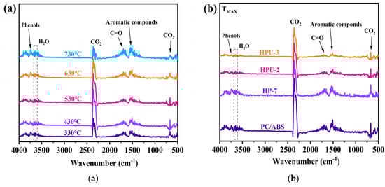 TG-IR spectra: (a) PC/ABS at different temperatures; (b) PC/ABS, HP-7, HPU-1, HPU-2 and HPU-3 at maximum weight loss temperature (TMAX).