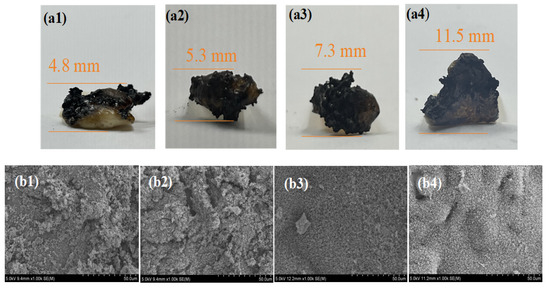 Micromorphology and SEM images of carbon residue after vertical combustion test: (a1,b1) PC/ABS, (a2,b2) HP-7, (a3,b3) HPU-2, and (a4,b4) HPU-3.