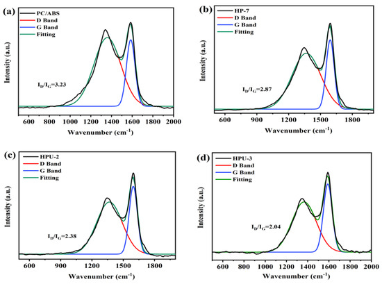 Raman spectra of PC/ABS (a), HP-7 (b), HPU-2 (c), and HPU-3 (d) carbon residues.