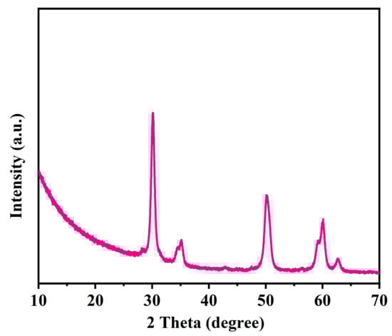 XRD was used to analyze the crystalline structure of the pyrolysis products of UiO-66. The prepared UiO-66 was placed in a muffle furnace at 600 °C for 0.5 h and collected for testing. As shown in Figure 11, the XRD pattern shows the characteristic peaks of the thermal barrier material, zirconium oxide. When the material burns, zirconium oxide can slow down the heat transfer rate and prevent the combustion products from spreading from the PC/ABS matrix to the burning area, to some extent. Therefore, after the material underwent intense combustion, although a large amount of the framework structure of UiO-66 was destroyed, its pyrolysis product—zirconium oxide—could still participate in smoke suppression.