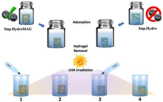 Photocatalytic degradation protocol was adapted to MI materials. MI hydrogels with and without magnetite were immersed overnight with the Lome solutions (1 × 10−5 M) to reach the adsorption/desorption equilibrium (see experimental part). After that, samples were washed, immersed in distilled water or H2O2 solution, and subjected to UVA irradiation for up to 6 h, as depicted in Figure 1.