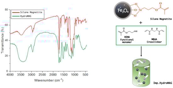 FTIR spectra of silane–functionalized magnetite (red line) and imprinted magnetic hydrogel (green line).