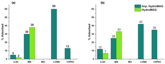 Figure 3 shows the performed absorbance tests for the Lome-imprinted materials (Figure 3a) and the Cipro-imprinted ones (Figure 3b). The Lome-imprinted material had a clear-cut selectivity towards the target analyte, thus confirming the success of the imprinting process: 60% of the Lome was adsorbed by Imp.HydroMAG. Importantly, the HydroMAG reference sample was inefficient in sequestering Lome (Figure 3a). Adsorbing capacities tested towards 2,4 D, MB, MO, and Cipro showed a clear selectivity of the synthetized materials since the registered depletion of values. On the other hand, the use of Cipro as a templating molecule yielded a selectivity of 35% in Cipro and 42% in Lome (Figure 3b). It is reasonable to suppose that the presence of cyclopropyl and/or the absence of fluoride, if compared to the Lome structure, determine a decrease in the imprinting affinity by the HEMA/MBA network.