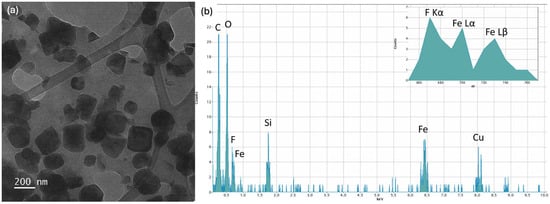 (a) BF TEM image of the imprinted Fe3O4 nanoparticles obtained after the antibiotic removal; (b) relative EDS spectrum with inset highlighting the absence of F Kα peak at 697 eV, confirming the physical removal of the antibiotic.