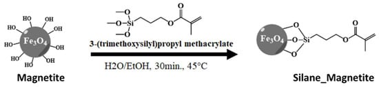 The Stöber method [24] was adapted to silanize the magnetite with the acrylate derivative. In a 200 mL beaker, 1 g of magnetite nanopowders was suspended in a 50 mL mixture of water/ethanol 70/30 v/v. This suspension was sonicated using an Ultrasonic Probe Sonicator. The pH was led to 9 using an ammonia solution, and subsequently, 40 mmol of 3-(trimethoxysilyl)propyl methacrylate was added to the reaction mixture, maintaining the sonication for 30 min. The precipitate was washed with water at least three times and dried under a vacuum.