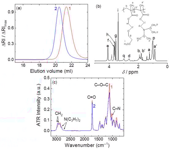 (a) SEC chromatogram of PDEGMA (curve 1) and PDEGMA-b-PDIPAEMA (curve 2). (b) 1H NMR spectrum of PDEGMA-b-PDIPAEMA. (c) ATR-FTIR spectrum of PDEGMA (curve 1) and PDEGMA-b-PDIPAEMA (curve 2).