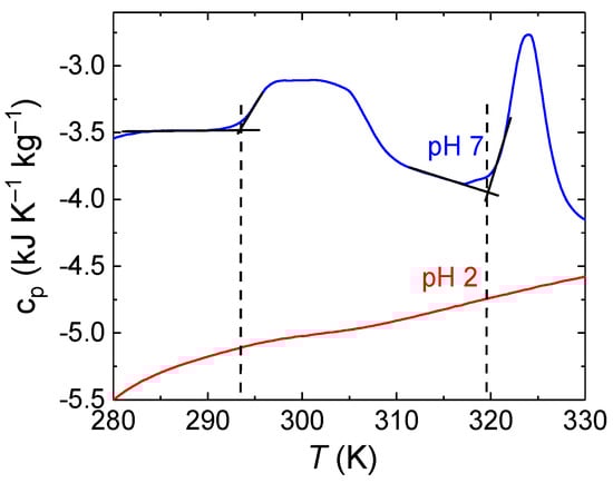 DSC thermograms of PDEGMA-b-PDIPAEMA aqueous solutions at pH = 2 and pH = 7. The molar heat capacity is expressed per 1 mol of PDEGMA-b-PDIPAEMA molecules. The dashed lines indicate the onsets of the transitions at 293 and 319 K.
