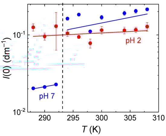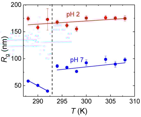 are plotted in Figure 3 and Figure 4. At pH = 7, both I(0) and Rg steeply increased around 293 K, indicating association of PDEGMA-b-PDIPAEMA chains above the LCST of PDEGMA. On the other hand, at pH = 2 both I(0) and Rg remained almost constant in the studied temperature range, at about 0.1 dm−1 and 175 nm, respectively, indicating that the copolymer formed associates even below the LCST of PDEGMA and those associates did not change significantly with passing through the LCST transition of PDEGMA. This behavior was most likely caused by the formation of complexes stabilized by hydrogen bonds between COOH and CH2CH2O groups, similarly to complexes formed by poly(ethylene oxide) with poly(acrylic) [] or poly(methacrylic acid) [] in aqueous solutions at low pH. Such interaction would render PDEGMA domains more compact and/or hindered, which would result in limited ability of PDEGMA to undergo conformational rearrangement upon dehydration.