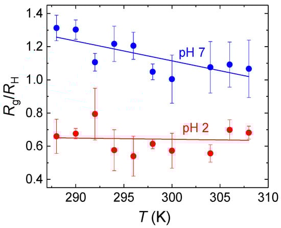 While associates formed at pH = 2 were compact as indicated by the estimated values of Rg/RH ratios, being lower than 0.78, the value for uniform hard spheres (Figure 5), those formed at pH = 7 were much looser with Rg/RH > 1. This observation can be explained by the formation of hydrogen bonds between terminal COOH groups and CH2CH2O groups of PDEGMA which promoted formation of compact PDEGMA domains in the associates. Unlike pH = 2, at pH = 7 the ratio was also slightly decreasing with increasing temperature as a result of decreasing hydration of copolymer chains.