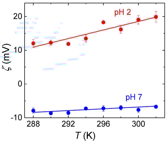 Temperature dependences of zeta potentials were measured on a Zeta Sizer Nano ZS (Malvern, UK) equipped with a Peltier module for temperature control, using dip cells with palladium electrodes. Zeta potentials ζ were calculated from electrophoretic mobilities μ using the Henry equation in the Smoluchowski limit, ζ = μη/ε, where ε is solvent permittivity. The values are averages of 5 measurements, each consisting of 3–10 runs.