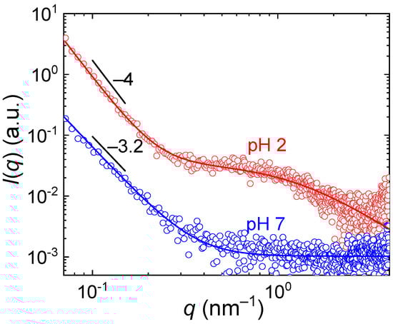 where I0 and I1 are the pre-factors, α is the power law exponent and ξ is the correlation length. The power-law term dominated the scattering behavior for q < 0.4 nm, corresponding to the length scales 15–90 nm. The exponent α < −3 suggested that the associates were homogeneous at those length scales and scattering occurred at interfaces. The associates formed at pH = 2 showed the Porod scattering with α = −4, indicating a flat interface, while at pH = 7 the exponent was higher, α = −3.2, thus indicating a surface fractal character of the interface.