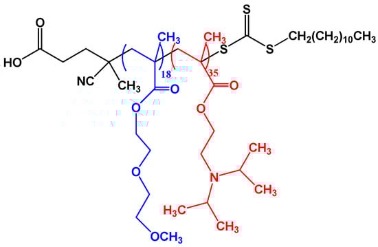 The structure of PDEGMA-b-PDIPAEMA prepared by RAFT polymerization using 2-cyano-2-[(dodecylsulfanylthiocarbonyl) sulfanyl] propane as CTA. Blue: PDEGMA block, red: PDIPAEMA block.