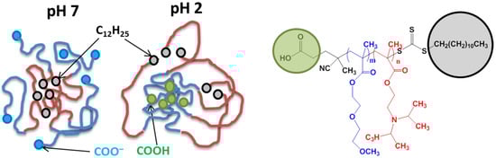 Specifically, block copolymers which are able to swap soluble and insoluble blocks upon change of conditions and form reverse core/shell nanoparticles have been referred to as “schizophrenic” [,,]. These swaps occur spontaneously upon change of external stimuli, which distinguishes schizophrenic block copolymers from many amphiphilic block copolymers with kinetically frozen hydrophobic cores in aqueous solutions. Transitions of the blocks from hydrophilic to hydrophobic and vice versa may lead to extensive morphological transitions []. Typically, schizophrenic block copolymers consist of at least one thermoresponsive block [] often in combination with weak polyelectrolyte blocks which allow for triggering micellization of the copolymer by changes in pH.