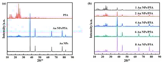 To detect the structural pattern of this obtained Au NPs/P5A composite, X-ray diffraction (XRD) detection was carried out to compare the pristine P5A, Au NPs, and the hybrid composite, as shown in Figure 1. The diffraction peaks appeared at 2θ = 38.2°, 44.4°, 64.4°, and 77.8°, corresponding to the (111), (200), (220), and (311) crystal planes of Au NPs, respectively, which proved that HAuCl4 was reduced successfully during the formation of Au NPs (Figure 1a). In addition, the characteristic peaks of P5A and Au NPs simultaneously appeared in the XRD pattern of the hybrid composite of Au NPs/P5A, demonstrating the coassembly behaviors of Au NPs and P5A. Furthermore, Figure 1b shows the same characteristic peaks in the XRD patterns of Au NPs/P5A composites but with different contents of Au NPs, showing that the intensity of characteristic peaks of Au NPs/P5A catalysts was strengthened with the increase in Au NPs. Thus, sharp diffraction peaks by XRD clearly indicate that the as-prepared Au NPs/P5A composites possess desired crystallinity.