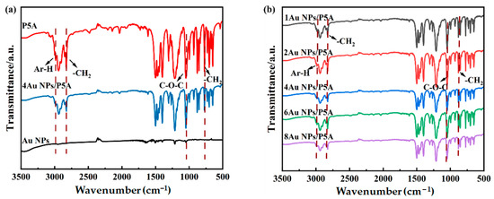 Comparison of FTIR spectra of P5A, Au NPs, and Au NPs/P5A (a), as well as spectra of hybrid composites with diverse amounts of Au NPs (b).