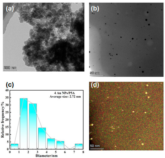 Comparison of TEM images of Au NPs in the absence (a) and presence of P5A (b), the particle size distribution of Au NPs/P5A as statistically calculated by TEM observations (c), and TEM mapping technology employed for distinguishing diverse key elements in hybrid composites (d).