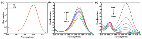 The performance of different catalysts, i.e., Au, Au NPs/P5A, and P5A, were initially tested regarding the catalytic reduction efficiency of reducing 4-NP, as shown in Figure 4. The control experiment using P5A as the named “catalyst” had no catalytic effect on the decomposition of 4-NP after 24 h as shown in Figure 4a with no differences between red and black lines. In addition, another control experiment using pristine Au NPs as the catalyst did show a bit of a catalytic effect, but with poor catalytic performance. The reduction rate of 4-NP in that case was only 50% after 60 min (Figure 4b). Finally, the Au NPs/P5A composite as the catalyst exhibited a higher catalytic effect, achieving a reduction rate of more than 90% within 20 min (Figure 4c). Thus, the Au NPs/P5A composite does exhibit better catalytic performance than the pristine Au NPs. This might be caused by the agglomeration of Au NPs being significantly reduced with the assistance of P5A in the hybrid composite.