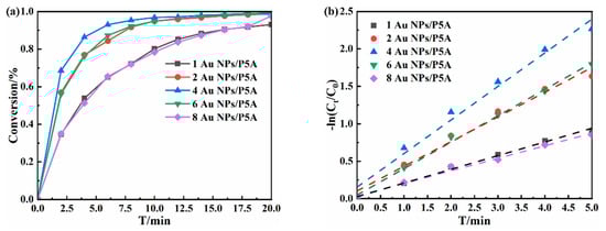 Furthermore, the catalytic performance of such composite with different amounts of loaded Au NPs for the reduction of 4-NP was thoroughly tested, as shown in Figure 5 and Table S1. It was found that the catalytic rate of 1 Au NPs/P5A was low, and the catalytic reduction conversion rate of 4-NP was also low within 20 min, with the conversion rate at 90%, due to the lower content of Au NPs. With the increase in loaded Au NPs, the conversion rate of 4-NP simultaneously increased gradually, due to the accordingly increased catalytic active sites and the subsequently improved catalytic efficiency. Particularly, the sample of 4 Au NPs/P5A had the best catalytic effect, while with the further increase in Au NPs, the conversion rate of 4-NP showed a downward trend, due to the possibility of agglomeration of particles in the limited space on the surface of the P5A film, leading to the poor dispersion of particles as well as stacked active sites.