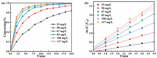 The effect of the initial concentration of the substrate, 4-NP, on the catalytic performances such as the conversion rate was then evaluated, as shown in Figure 7. The results showed that there were no significant differences in the conversion rate from either the change in time (Figure 7a) or the conversion rate reached in 20 min (Figure 7b). Thus, the prepared catalyst is applicable in a relatively wide concentration range and maintains high catalytic activity. By considering that the industrial wastewater does not contain the high concentration of 4-NP, the concentration of 90 mg·L−1 for initial 4-NP is used in subsequent experiments.