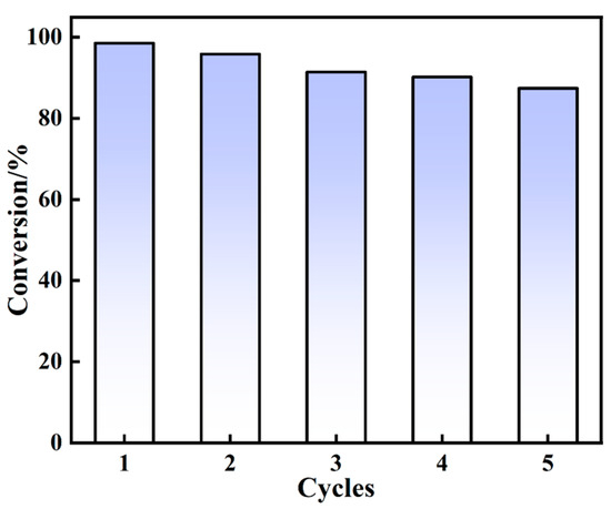 The regeneration performance of the catalyst affects the cost of production in practical engineering and industrial applications, which is an important indicator to evaluate the quality of the catalyst. First, 90 mg·L−1 of initial 4-NP was selected for the reaction at room temperature. Then, the composite sample of 4 Au NPs/P5A at the concentration of 67 mg·L−1 was used as the catalyst, and NaBH4 was used as the reducing agent. After the catalytic reaction was completed, the used 4 Au NPs/P5A catalyst was further washed and dried, and the repeated catalyzation was then carried out five times, as shown in Figure 9. As the recyclization number increased, the catalytic conversion rate of 4-NP by the hybrid composite gradually decreased from 98.57% to 87.45%. The catalytic efficiency does have the trend of decreasing, but the composite after recycling still maintains a reasonable catalytic activity, indicating that the Au NPs/P5A can be repeatedly used for the catalytic reduction of 4-NP.