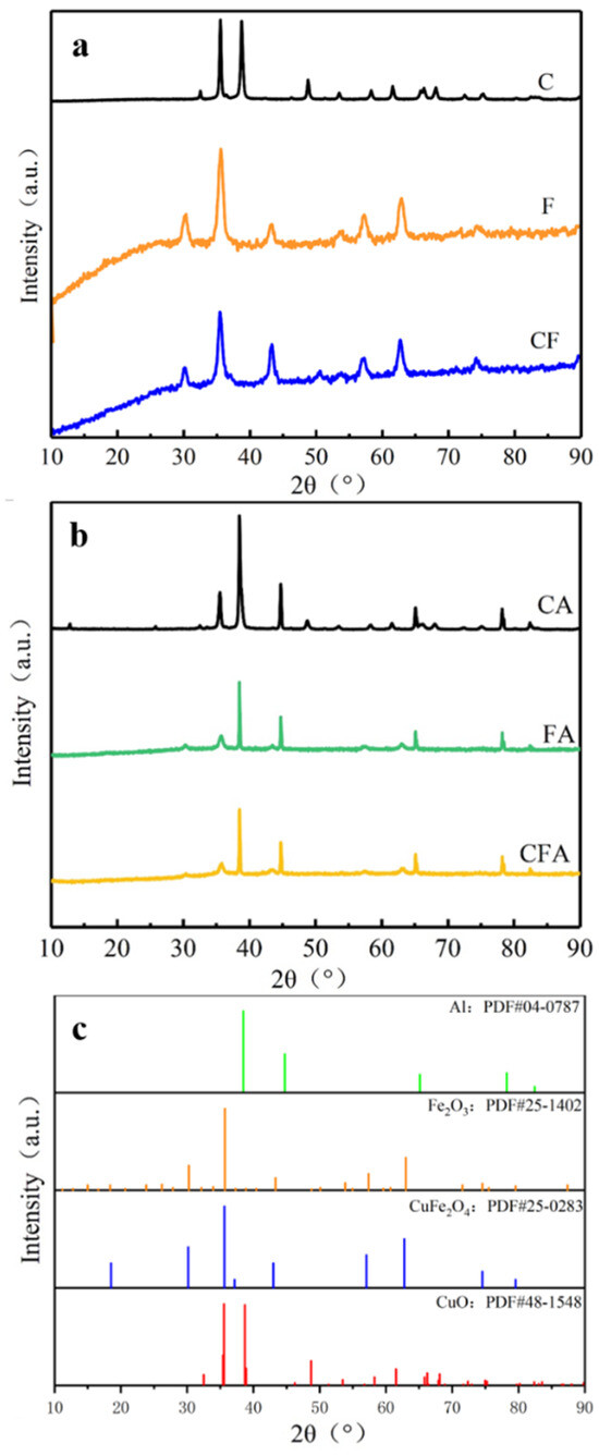 Figure 2. X-ray diffraction patterns of copper ferrites: (a) MICs (b) and PDF cards of Al, Fe2O3, CuFe2O4, CuO (c).