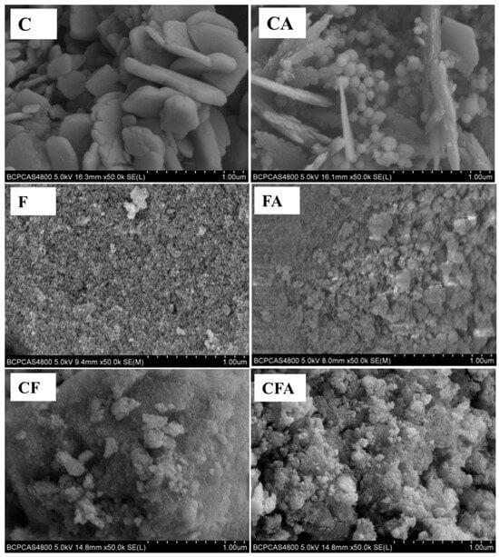 The surface morphologies of the MICs were observed by SEM, as shown in Figure 3. It can be seen from the figures that F and CF have a rough surface, while the surface morphologies of C are relatively smooth. The sample surface became rougher as the Al was added. The particles with a diameter of about 90 nm, that is, n-Al particles, can be clearly observed in the structure of the CA. But the same particles were not observed in the FA and CA, which indicates that the n-Al particles exist inside the structure of Fe2O3 and CuFe2O4. And this composite form that exposes oxides to the outermost layer is conducive to increasing the contact probability between the catalyst and the catalyzed substance and improving the catalytic activity when used as a catalyst for other reactions.