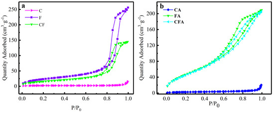 Figure 4. Nitrogen adsorption-desorption isotherms of copper ferrites (a) and MICs (b).