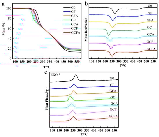 Figure 5. TG (a), DTG (b), and DSC (c) curves of MICs/GAP-ETPE.
