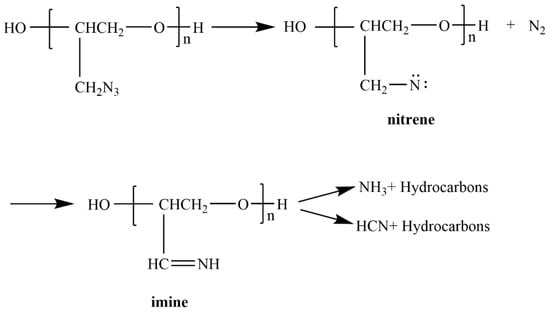 The thermal decomposition process of GAP-ETPE is shown in Figure 6. The first step of the thermal decomposition of azide groups is the breaking of the RN-N2 bond to generate nitrene, followed by the rearrangement of nitrogen to generate imine, and the release of N2 imine to generate NH3 through a H transfer and free radical transfer, or the breaking of the C-C bond to generate HCN, etc. The formation of NH3 is an exothermic reaction, and the formation of HCN is an endothermic reaction.