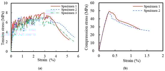 Stress–strain relationships of the ECCs: (a) tension and (b) compression.