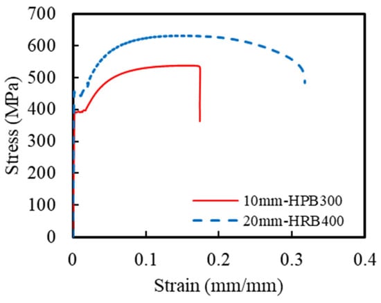 This corrosion-resistant composite structural column incorporated multiple materials, including ECCs, concrete, GFRP spirals, steel spirals, and longitudinal steel rebar. The ECC mixture design followed a previous research by Li et al. [21], with detailed specifications listed in Table 1. The compressive and tensile strengths of the ECCs were obtained using standard testing methods. Based on ASTM C469 [37], uniaxial compression tests were conducted on three ECC cylindrical specimens with dimensions of Φ150 mm × 300 mm. The measured 28-day average compressive strength of the ECCs was 49.6 MPa. Additionally, uniaxial tensile tests were conducted on three dog-bone-shaped specimens, according to the standards of the Japan Society of Civil Engineers [38], to determine the tensile properties of the ECCs. Figure 2 shows the uniaxial compression and tensile stress–strain curves of the ECCs. The average tensile strength of all specimens was 7.4 MPa, and the ultimate tensile strain reached 3.8%. The concrete used in the ECCs and traditional reinforced-concrete columns was C40-grade commercial concrete. During the casting of the concrete columns, 4 sets of a total of 12 cubic specimens with dimensions of 100 mm × 100 mm × 100 mm were reserved. The measured 28-day average compressive strength of the concrete was 53.2 MPa. Additionally, uniaxial tensile tests were conducted on HRB400-grade longitudinal rebar and HPB300-grade spirals based on GB/T 228.1-2021 [39]. Figure 3 shows the uniaxial tensile stress–strain curves of HRB400 and HPB300 grade rebars. The elastic modulus of the HRB400 steel bar was 202 GPa with a yield strength of 438 MPa. The elastic modulus of the HPB300 steel bar was 205 GPa with a yield strength of 380 MPa. The mechanical parameters are summarized in Table 2. The material parameters of the GFRP spirals were taken from the manufacturer’s material test report, as shown in Table 3.