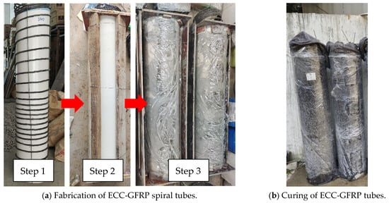 Unlike the conventional process for fabricating reinforced-concrete columns, the casting of ECC-GFRP spiral-confined RC columns involves two main stages: the fabrication of the ECC-GFRP tube and the casting of ordinary concrete. Figure 4 illustrates the step-by-step process of fabricating ECC-GFRP spiral-confined RC columns that was used in this work. (1) PVC pipes were used as the inner and outer formwork for fabricating the ECC-GFRP tube. The GFRP spiral was tied and fixed to the inner formwork according to the spacing designed in Figure 1. Then, the outer PVC formwork for the ECCs was installed and secured. In considering a ECC tube length of 1350 mm and a thickness of only 30 mm, an insertion-type vibrator could not be used for compacting (Figure 4a). Therefore, the ECC tube was cast and compacted by placing the PVC formwork horizontally on a vibrating table with side openings on the outer formwork to ensure proper compaction. (2) After 48 h of ECC casting, the inner and outer PVC formwork were removed, and then the ECC tubes were wrapped in wet geotextile and plastic film for 14 days of water curing (Figure 4b). (3) To enhance the bonding strength between the concrete and ECC interfaces, the ECC surface in contact with the concrete was roughened (Figure 4c). (4) The base rebar and longitudinal rebar of the column were made, and the prefabricated ECC-GFRP tube was placed in the design position as an outer formwork, i.e., fitted over the longitudinal rebar (Figure 4d). (5) Finally, the wooden formwork for the base and column cap were installed, and commercial concrete was cast (Figure 4e). (6) Two days after casting, the formwork was removed, and the ECC-GFRP RC columns were cured at ambient temperature for 28 days (Figure 4e).