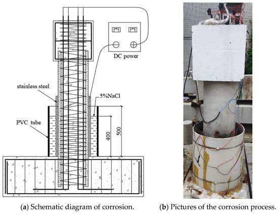 Considering that, during the serviceability life cycle of the structure, the plastic hinge region bears the main bending resistance under horizontal loads [40,41,42], and the bottom of the bridge columns is also located in the splash zone with severe environmental corrosion [43,44,45], the electrochemical accelerated corrosion area was set in this study within a 400 mm height from the bottom of the column, as shown in Figure 5. To accurately compare the corrosion resistance of the two types of columns, both the stirrups and longitudinal bars of the RC column were subjected to accelerated electric corrosion. Considering that, in real structures, the corrosion of stirrups is more severe, nylon tubes were used to insulate the stirrups and longitudinal bars to corrode them separately, with the target corrosion rate of the stirrups being 2.5% higher than that of the longitudinal bars [46]. Before casting the concrete, electric conduction wires were pre-embedded in the reinforcement cage, with the top of the reinforcement extending 200 mm for subsequent connections to the power supply (Figure 4f). As shown in Figure 5a, firstly, a stainless-steel mesh was wrapped around the corrosion area of the column, serving as the cathode, and then a PVC tube was placed on the outside, which was sealed at the bottom with glass glue and epoxy resin to prevent leakage; a NaCl solution with a salt concentration of 5% was added and left to stand for 3 days to ensure that the chloride ions penetrated the surface of the reinforcement. The longitudinal bars, stirrups, and stainless-steel mesh were connected to wires, with the longitudinal bars and stirrups connected to the positive pole of the power supply and the stainless-steel mesh connected to the negative pole. The corrosion current values were monitored by the readings of a DC ammeter, which is observed every 12 h. Additionally, according to Faraday’s law, the chemical change in the mass of the substance on the electrode interface is proportional to the electrical power passing through the material. The electrification time and the applied current to the specimen can be calculated using Equations (1) and (2), respectively: