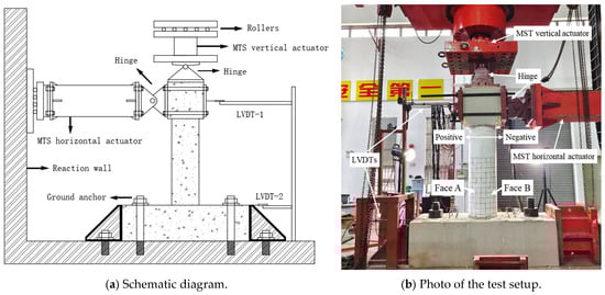 To simulate the vertical loads and cyclic horizontal loads that concrete columns may encounter during earthquakes, the WAW-J12000 active follow-up loading system from Hangzhou Bangwei Electromechanical Control Engineering Co., Ltd. Hangzhou, China was used for testing, as shown in Figure 6. The top of the vertical loading actuator was connected to a rolling pulley, allowing the vertical actuator to follow the horizontal actuator when applying horizontal loads, ensuring that the axial force remains vertical throughout the loading process. A linear variable differential transformer (LVDT) was installed at the top of the column to measure the horizontal displacement at the top. Additionally, considering potential slippage at the base during horizontal load application, another LVDT was placed at the base to correct the top horizontal displacement (Figure 6b).