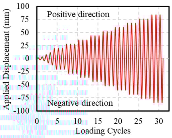 During the test, the axial load was applied using load control until the design value was reached and then held constant, with a loading rate of 50 kN/min. Horizontal loading was applied using displacement control, at a loading rate of 10 mm/min. Before applying horizontal loads, axial loading was performed first, applying 40% of the design vertical load (an axial compression ratio of 0.4). Then, a horizontal force that did not exceed 40% of the theoretical cracking load was applied in cyclic loading for three cycles. All bolts were then tightened again to eliminate the gaps between the fixtures and the specimen. During cyclic loading, the application of thrust was defined as positive loading, whereas the application of tensile force was defined as negative loading. All specimens were subjected to a push–pull loading sequence. The loading schedule, as shown in Figure 7, included the first four displacement levels of 2 mm, 4 mm, 8 mm, and 12 mm, each cycled once. Subsequently, the displacement increment was 8 mm, with each level cycled three times. The test was terminated when a sudden decrease in bearing capacity occurred due to core concrete crushing, rebar fracture, or GFRP spiral rupture. In this test, the side under compression during positive loading was defined as Face A, and during negative loading, it was defined as Face B (Figure 6b).