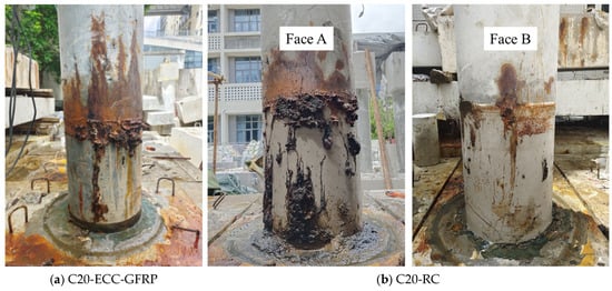 After the accelerated corrosion test, the corrosion patterns of the ECC-GFRP spiral-confined reinforced-concrete column and the conventional reinforced-concrete column were recorded, as shown in Figure 8. As seen in the figure, the corrosion products of the internal rebar exuded along the cracks on the surface of the columns, with the ECC-GFRP spiral-confined reinforced-concrete column (Figure 8a) exhibiting significantly fewer corrosion products than the traditional reinforced-concrete column (Figure 8b). The ECC material had an excellent crack control, and cracks are difficult to observe on the surface of the column (Figure 8a). This crack control ability further inhibited the penetration of corrosive agents under electrical conduction. Therefore, the C20-ECC-GFRP concrete column showed fewer corrosion products. For the traditional reinforced-concrete column (C20-RC in Figure 8b), the surface cracks were significant and accompanied by a substantial exudation of corrosion products, with some areas experiencing spalling of the concrete cover. The differences in the corrosion patterns of the two types of columns further demonstrated the excellent anti-corrosion capability of the ECC-GFRP spiral protective layer. It is noteworthy that the corrosion distribution along the circumference of the reinforced-concrete column was severely nonuniform. As shown in Figure 8b, Face A had significantly more corrosion products than Face B. This phenomenon also indicates the randomness of concrete cracking due to corrosion expansion, where the cracked areas further facilitate the transmission of corrosive agents, accelerating localized corrosion. However, the C20-ECC-GFRP concrete did not show significant localized corrosion due to the fine crack characteristics of ECC.