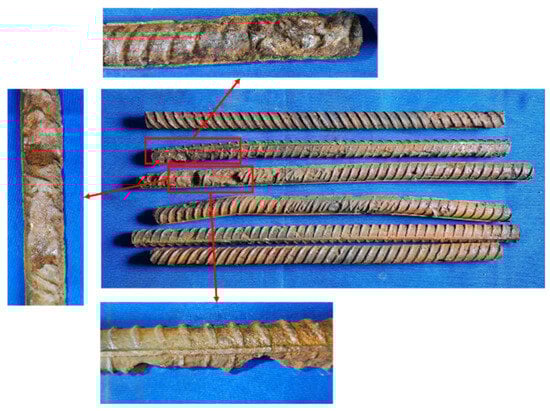 To more accurately assess the internal rebar corrosion condition, the corroded stirrups and longitudinal bars from the bottom 400 mm region of the columns were removed after the hysteresis test, and the actual corrosion rates were calculated. The rebar corrosion conditions for Specimens C20-RC and C20-ECC-GFRP are shown in Figure 9 and Figure 10, with their corresponding actual corrosion rates listed in Table 5. As seen in the figures, the longitudinal bars of C20-RC exhibited not only localized pitting, but also large cross-sectional corrosion (Figure 9a), with a corrosion rate of 14.81%. Notably, the stirrups showed severe corrosion (24.37%), with some sections nearly fractured after corrosion (Figure 9b). Thus, the corroded RC structure almost lost the confinement and reinforcement function of the stirrups. In contrast, the longitudinal bars of the C20-ECC-GFRP column mainly exhibited individual pitting, with its overall corrosion being significantly better than traditional reinforced concrete. Moreover, since the GFRP spiral bars replace steel, the C20-ECC-GFRP column had no stirrup corrosion. Compared to the traditional reinforced-concrete column, the actual longitudinal bar corrosion rate of C20-ECC-GFRP was only 11.59%, which is significantly lower than that of C20-RC. This further confirms that the ECC-GFRP spiral reinforcement protective layer effectively inhibits chloride ion penetration, exhibiting superior corrosion retardation capabilities for the rebar.