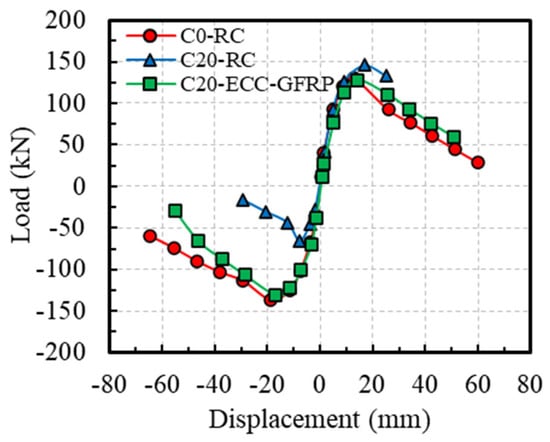 Comparing the uncorroded Specimen C0-RC with the corroded Specimen C20-RC revealed that the traditional reinforced-concrete specimen, after undergoing accelerated corrosion tests, exhibited a significantly pinched hysteresis loop due to severe corrosion of the stirrups. This indicates a substantial impact of corrosion on the seismic performance of reinforced concrete (Figure 12a,b). However, for the corroded Specimen C20-ECC-GFRP with ECC-GFRP used as a protective layer, the load–displacement hysteresis curve remained full despite undergoing severe corrosion. This demonstrates that the ECC-GFRP protective layer not only reduces the corrosion of the longitudinal bars, but also effectively prevents the reduction in confinement efficiency caused by the corrosion of the steel stirrups, thus ensuring the seismic performance of the concrete column in a corrosive environment. Notably, the C0-ECC-GFRP column exhibited significant differences in bearing capacity between positive and negative loading, which was attributed to the markedly different failure modes in the two directions (Figure 12c). This failure mode is atypical, so the data from this specimen are not included in subsequent analyses.
