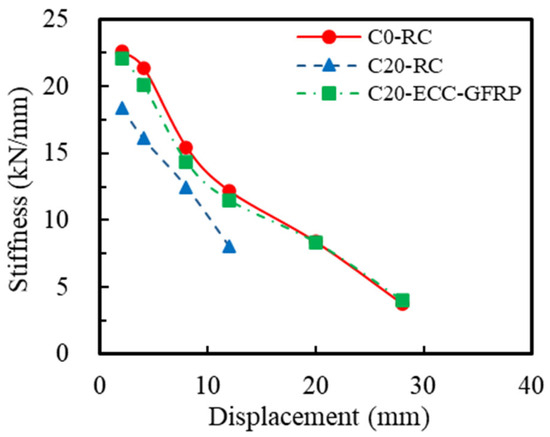 where represents the secant stiffness at the i-th displacement level and denotes the positive and negative peak loads at the i-th displacement level (red dotted line in Figure 15), and and indicate the positive and negative peak displacements at the i-th displacement level, respectively. The stiffness degradation derived from Equation (3) is illustrated in Figure 16. A comparison of the curves for Specimens C0-RC and C20-RC revealed that corrosion significantly impacted the initial stiffness of the RC specimens and markedly accelerated the rate of stiffness degradation. This is because the corrosion not only weakened the stiffness of the steel bars in the RC column (reduction in cross-sectional area), but it also weakened the bond between the steel bars and concrete. However, under identical corrosion conditions, the stiffness degradation trend of the ECC-GFRP-protected specimens (C20-ECC-GFRP) closely mirrored that of the uncorroded RC specimens (C0-RC), with both performing significantly better than the corroded RC specimens (C20-RC). At equivalent displacements, the stiffness of the C20-ECC-GFRP exceeded that of C20-RC. These experimental results indicate that the ECC-GFRP spiral-confined RC column can significantly mitigate stiffness degradation due to corrosion, thereby ensuring effective deformation control of the structure under extreme conditions.