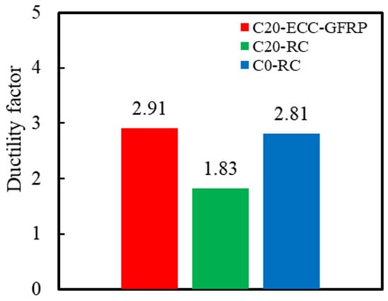where denotes the displacement ductility coefficient; signifies the yield displacement; and represents the ultimate displacement. Using this formula, the ductility coefficients of the specimens were captured, as presented in Table 6 and Figure 17. As illustrated in this figure, the ductility coefficient of the corroded Specimen C20-RC (1.83) was markedly lower than that of the uncorroded Specimen C0-RC, indicating that rebar corrosion significantly diminishes the ductility of RC columns. However, under identical corrosion conditions, the ductility coefficient of Specimen C20-ECC-GFRP was 59.33% higher than that of Specimen C20-RC. This improvement is attributed to the ECC-GFRP spiral tube’s capability to delay internal rebar corrosion and its exceptional corrosion resistance, which prevent the premature stirrup failure caused by corrosion. The ECC-GFRP spiral tube continued to provide effective confinement to the concrete, thereby enhancing its ductility even after corrosion.