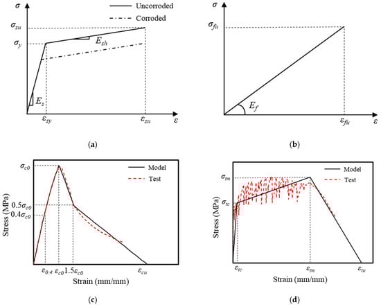 where denotes the yield strength of the corroded rebar; signifies the correction factor, taken as ; and represents the corrosion rate of the steel. The tensile properties of GFRP employed a linear elastic constitutive model (Figure 19b). The ECC material adopted a simplified model based on the typical stress–strain curves obtained from uniaxial tension and compression tests [49]. The stress and strain characteristics of the material’s constitutive model were matched to the experimental data obtained in this study (Figure 2). Figure 19c,d demonstrate that the experimental data and the model exhibited a good match. The concrete material model adopted the improved FRP-confined concrete constitutive model proposed by Yu et al. [50] to account for the mechanical performance enhancement under confined stress, with the confinement efficiency defined and calculated through a user-defined subroutine. The material elements of the concrete and ECCs were modeled using C3D8R elements, while the material elements of the steel bar and GFRP spiral were modeled using T3D2 elements, with a model mesh size of 20 mm. To simplify the model and enhance computational efficiency, the longitudinal rebars and GFRP spiral were embedded into the matrix material. The bond–slip behavior between the rebars and concrete was simulated by incorporating spring elements. It was assumed that no relative displacement occurred between the rebars and concrete in the normal direction; therefore, the stiffness of the spring elements in the normal direction (the X and Y directions in this model) was set to be infinite. The bond–slip relationship between the rebars and concrete in the tangential direction (the Z direction in this model) was simulated by nonlinear spring elements, with the load–displacement behavior of the Z-direction spring elements following the bond–slip model for the ECC-GFRP spiral-confined concrete, as calculated by Expression (6).