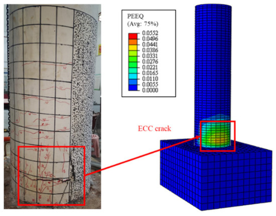 Figure 21 illustrates the comparison of the failure modes between the numerical simulation and the experiment, where the final failure mode of the model was the ECCs cracking at the column base and the concrete being crushed, matching the failure mode of Specimen C20-ECC-GFRP in the experiment. The results demonstrate that the established finite element model can effectively simulate the load–displacement behavior of ECC-GFRP spiral-confined RC columns.