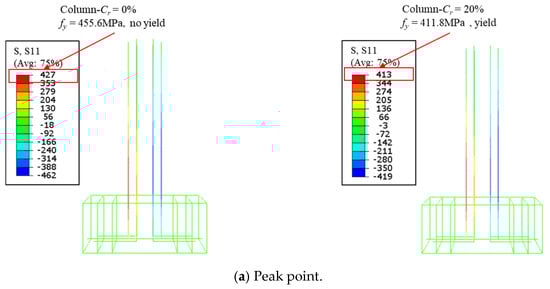 Figure 20 compares the skeleton curve results from the experiment (Specimen C20-ECC-GFRP) in this study and the model-predicted results from FE simulation. As shown in Figure 20, the model closely fit the ascending segment of the curve, while the descending segment of the model curve slightly deviated from the experimental curve. This deviation is attributed to the numerical model not accounting for the bond–slip issue between the ECCs and GFRP spiral. Therefore, the bond–slip relationship between stirrups and ECC was considered necessary. However, this issue is beyond the scope of the current study and will be addressed in future research. Despite this, the peak load obtained from the experiment was 128.2 kN, and the peak load from the model was 127.7 kN, with an error of only −0.38%, which further validates the effectiveness of the numerical simulation.