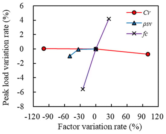Table 9 and Figure 24 show the statistical table and sensitivity comparison chart of the impact of each parameter on the peak load capacity, respectively. It can be seen from this figure that changes in the volumetric stirrup ratio and concrete compressive strength exhibited a linear increasing trend with the peak load capacity, while the corrosion rate showed a negative correlation with the peak load capacity. Among these parameters, concrete compressive strength had the greatest impact on the peak load capacity of ECC-GFRP spiral-confined RC columns, while the corrosion rate had the least impact.